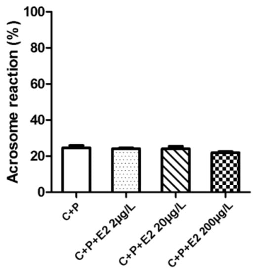 In order for mammalian sperm to fertilize, it must undergo a series of maturation events in the female reproductive tract, called capacitation []. In general, capacitation involves membrane rearrangement, cholesterol efflux, activation of specific signal transduction pathways leading to protein tyrosine phosphorylation (TyrP), and cytoskeleton rearrangements [,,]. As much as capacitation-related increase of TyrP has been postulated to be a key capacitation marker [,], a study [] showed that this may not be an essential event in mouse sperm, and lack of TyrP can be bypassed in vivo by an as yet unknown mechanism. Therefore, it is important to evaluate the status of capacitation by other parameters, such as motility and sperm ability to undergo acrosome reaction (AR). Hamilton-Thorne Computer-Aided Sperm Analysis (CASA) is generally used for the monitoring of sperm motility and provides a set of standard kinematic parameters that aids with the identification of changes in trajectories and flagellar beating patterns connected with hyperactivation as an important part of sperm capacitation [,]. In vivo capacitation occurs mainly in the uterus and oviducts, facilitated by substances in the female genital tract including estrogen. It has been demonstrated that endocrine disruptors, including estrogen, significantly modulate capacitation in vitro and can also increase its speed [,,,,]. Estradiol and its analogues induced not only capacitation but also non-induced (spontaneous) AR []. Progesterone-induced AR [,], progesterone-enhanced sperm hyperactivation [,,], and progesterone-increased TyrP [,] are all suppressed by estradiol.