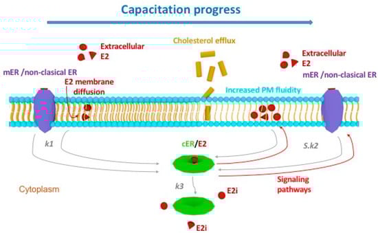 Capacitating sperm undergo several changes including plasma membrane reorganization, which changes its fluidity and improves reception of the extracellular estradiol E2, which passes via diffusion after its initial adsorption (controlled by Langmuir isotherm) onto specific PM adsorbents. These could be represented by mERs and/or non-classical ER. We would like to deliver a hypothesis for this mechanism, suggesting the formation of an adduct in the cytoplasm with the rate constant k1, which, when formed, serves as an autocatalytic agent, signalling an increase in PM fluidity directed by S·k2, where S is a degree of activity. This signalling event is accompanied by the complex cER/E2 disintegration characterized by the rate constant k3 and a release of estradiol remaining in the cytoplasm (E2i). The cERs remain internalized within the cytoplasm; however, they lose their receptivity and remain dormant (Appendix A in Supplementary Materials).