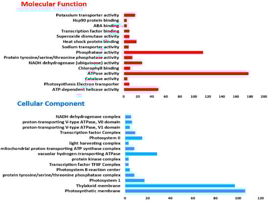 GO-based enrichment analysis functionally characterizes and annotated the 1, 591 (64.36% of 2, 472) DEGs into 45 functional groups, of which molecular function contains 15 groups, cellular component (15 groups) and biological process (9) (Figure 1 and Table S4) between control and salt-treated group. In molecular function (MF), “ATPase activity” (GO: 0042623) with 178 transcripts, followed by “phosphatase activity” (GO: 0008138) with 113 transcripts and least transcripts (4) were found in both “ABA binding (GO: 0010427)” and “Hsp90 protein binding (GO: 0010329)”. In cellular component (CC), “photosynthetic membrane” possessed the highest number of transcripts (GO: 0034357, 106 transcripts), whereas, “thylakoid membrane” consisted of 97 transcripts (GO: 0042651). Furthermore, in biological process (BP), “response to oxidative stress” (GO: 0006979) harbored 164 transcripts, followed by “salinity response” (GO: 0009651) with 148, while “SOS response (GO: 0009432)”, “stomatal closure (GO: 0090332)” and “cytochrome b6f complex (GO: 0010190)” with three transcripts each were the least group.
