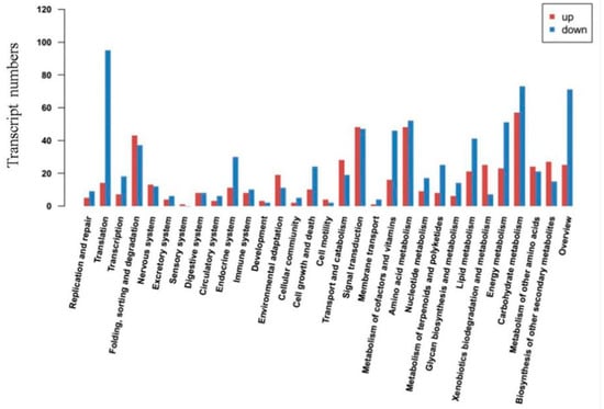 Kyoto Encyclopedia of Genetics and Genomics (KEGG) database analysis of DEGS (up and down-regulated) enriched in different biological pathways. The X-axis represents enriched pathways and Y-axis represents the total number of transcripts.
