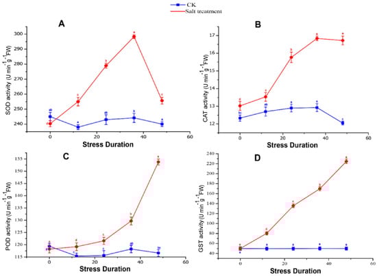 Leaf samples treated with 0.8% NaCl for 0, 12, 24, 36 and 48 h were used to determine the antioxidative enzymes activities, including SOD, CAT, POD and GST. The activity of SOD was measured using NBT at 560 nm; CAT activity was measured by monitoring disappearance of H2O2 at 240 nm, the POD was determined by guaiacol oxidation method following the method briefly explained by Haider et al. [74,75]. GST activity was determined using Glutathione S-transferase (GST) activity determination kit (Shanghai solarbio Bioscience & Technology Co., LTD, Shanghai, China) following the manufacturer’s protocol.