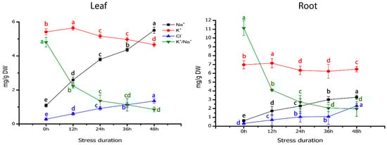 Ion concentrations of sodium (Na+), potassium (K+), chlorine (Cl−) and K+/Na+ ratio in leaf and root samples of grapevine grown for 48 h of salt stress. Values represent means ± SE (n = 3) and the significance level of 0.05 was used for different letters above bars.