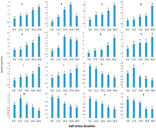 To validate the reliability of RNA-seq transcriptome, 16 DEGs were randomly selected to analyze the gene expression that was correlated with salt stress response and covering almost all the primary functions in various biological pathways, including transcription factors, metabolism, plant hormone signaling, disease resistance and ion transport (Table S11). The result suggested that expression of 16 DEGs treated with 0.8% soil salinity at the interval of 0, 12, 24, 36 and 48 h is inconsistent with the transcriptomic findings, validating the accuracy and reproducibility of the Illumina RNA-seq. Though, out of 16 DEGs, 12 DEGs showed recurrent expression pattern in response to salt stress, in which 8 genes were up-regulated (Figure 7a,c–e,g–j) and 4 genes were down-regulated (Figure 7k,n–p) with prolonged salt stress. Based on the expression patterns of these 12 genes, we selected them as candidate genes to further validate their expressional variations following the different concentrations of salt stress and recovery process.
