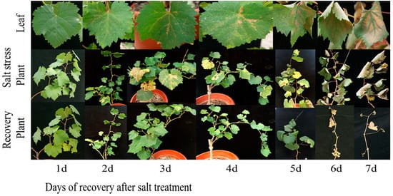 Grapevine growth status under salt stress and after removing salt stress. Grapevine plants were treated by 3.0% SS for 1, 2, 3, 4, 5, 6 and 7 days (d), respectively and recovered by washing away the salt in the medium. Recovered plants were photographed 15 days after salt stress was removed.