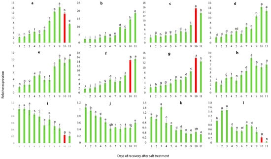 Expression patterns of the 12 candidate genes following the 11 days of 3.0% SS. Red bars indicate the sharp change in gene expression levels. Values represent mean ± SE (n = 3) and the significance level of 0.05 was used for different letters above bars. Genes with continual increasing or decreasing expression patterns were selected as candidate genes. a: VIT_05s0020g03740.t01, b: VIT_19s0015g01070.t01, c: VIT_05s0049g00520.t01, d: VIT_13s0067g02360.t01, e: VIT_04s0023g00530.t01, f: VIT_05s0049g01070.t01, g: VIT_06s0004g05670.t01, h: VIT_10s0003g01810.t01, i: VIT_07s0005g00160.t01, j: VIT_11s0052g01180.t01, k: VIT_14s0128g00020.t01, l: VIT_05s0062g00300.t01.