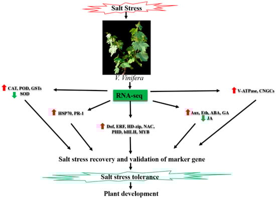 A schematic complex regulatory mechanism of salt stress tolerance in grapevine. Red arrows indicating up-regulated genes and green arrows indicating down-regulated genes. CAT, catalase; POD, peroxidase; GST, glutathione-s-transferase; SOD, superoxide dismutase; HSP70, heat shock protein 70 kDa; PR-1, Pathogenesis-related protein1; Dof, DNA-binding with one finger; ERF, ethylene responsive factor; HD-Zip, homeodomain-leucine zipper; NAC, NAC transcription factor; bHLH, basic helix-loop-helix; MYB, MYB transcription factor; Aux, auxin; Eth, ethylene; ABA, abscisic acid; GA, gibberellic acid; JA, jasmonic acid; V-ATPase, vacuolar-type ATPase; CNGCs, cyclic nucleotide-gated channels.