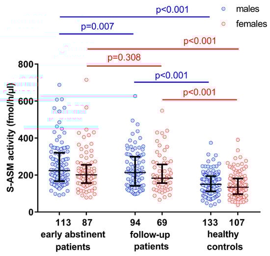 Sex-specific activity of the secretory acid sphingomyelinase (S-ASM) in alcohol-dependent male and female patients during early abstinence and follow-up, compared to healthy control subjects. Boxplots show individual data, and the median and interquartile range. The numbers of male and female individuals are provided below the x-axis. p-values were calculated using the Mann–Whitney U test except for the pair-wise comparison for patients where the Wilcoxon signed-rank test was applied.