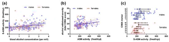 Correlation of serum S-ASM activity with blood alcohol levels and withdrawal in alcohol-dependent patients: (a) S-ASM activity is positively associated with blood alcohol levels of male and female patients at study inclusion; (b) S-ASM activity is positively associated with withdrawal severity in male and female patients assessed by the Clinical Institute Withdrawal Assessment for Alcohol revised scale (CIWA-Ar total score); (c) S-ASM activity is strongly positively associated with the CIWA-Ar sub-item tremor. S-ASM: secretory acid sphingomyelinase. Individual data with linear regression line and 95% confidence intervals (a,b) and boxplots with median and interquartile range (c).