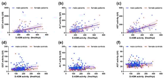 The liver is severely damaged by excessive consumption of alcoholic beverages as indicated by an increase in activities of the liver enzymes GGT, ALT, and AST. In line with the elevated S-ASM activities in patients, we have found strong and highly significant correlations of S-ASM with these liver enzyme activities (Rho > 0.37 and p < 6 × 10−8 for all three enzymes, Table 2, Figure 3). Interestingly, the strength of these associations was similar for both male and female patients.
