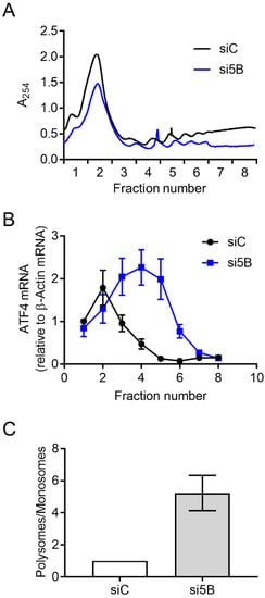 Depletion of eIF5B leads to increased translation of ATF4. HEK293T cells were reverse-transfected with a non-specific control siRNA (siC) or an eIF5B-specific siRNA pool (si5B), incubated 96 h, harvested in RNA lysis buffer, and subjected to polysome profiling analysis. (A) A representative polysome profile from control versus eIF5B-depleted HEK293T cells. (B) The proportion of ATF4 mRNA (relative to β-Actin mRNA) for each fraction from the panel (A). (C) Fractions 1–2 (representing monosomes) were pooled, as were fractions 3–8 (representing polysomes). The ratio of polysomes/monosomes is shown for a representative experiment. Data in panels (B,C) are expressed as the mean ± SD for technical triplicates. An independent experiment is shown in Figure S2.
