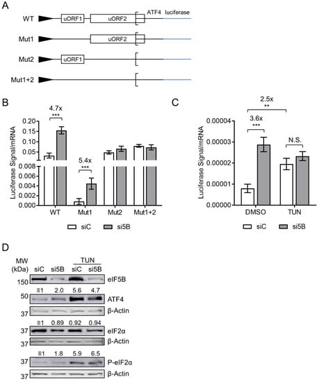 eIF5B represses ATF4 translation by a uORF-dependent mechanism. (A) Schematic representation of the ATF4-firefly luciferase reporter fusions used in this study, all transcribed from a minimal TK promoter. Note that Mut1 and Mut2 possess a start codon mutation (ATG to AGG) that inactivates the regulatory functions of uORF1 and uORF2, respectively. Mut1+2 possesses both mutations. (B) Control or eIF5B-depleted HEK293T cells were transfected with the above-mentioned plasmids (48 h post siRNA transfection). After another 48 h, the luminescence from firefly luciferase was measured and normalized to the steady-state levels of firefly luciferase mRNA (measured by RT-qPCR). (C) Luciferase levels were measured as in panel (B), except that the cells were treated with 5 µg/mL tunicamycin (TUN) for the last 6 h of the incubation prior to harvesting. Data are expressed as mean ± SEM for 3 independent replicates. ** p < 0.01; *** p < 0.001. (D) Immunoblots probing for eIF5B, ATF4, eIF2α, P-eIF2α, or β-Actin (internal control). Numbers above the blots represent their quantitation relative to β-Actin.