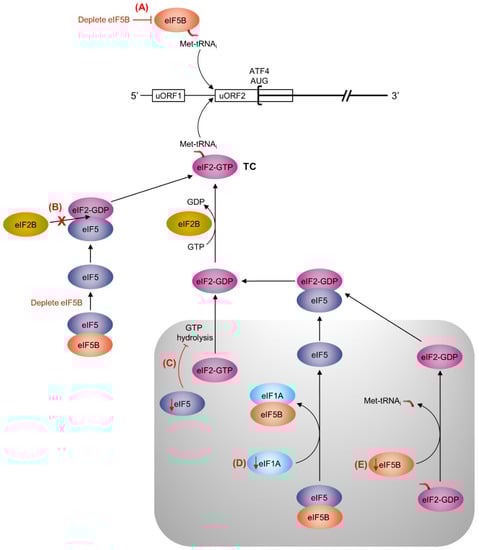 In Saccharomyces cerevisiae, overexpression of eIF5 mimics the effect of eIF2α phosphorylation, promoting translation of the yeast equivalent of the ATF4 protein, GCN4 [33]. Specifically, overexpression of eIF5 in yeast increases the levels of an eIF2-eIF5 complex, which prevents eIF2B interaction and thus ternary complex re-formation [33]. Similarly, in human cells, overexpression of eIF5 or its mimic (eIF5 mimicking protein) perturbs the function of eIF2 and induces ATF4 translation by delaying re-initiation at uORF2 [34]. As eIF5B interacts with eIF5 [26], it is possible that depletion of eIF5B leads to an increase in available eIF5, which would bind eIF2 and prevent ternary complex formation, leading to increased translation of ATF4 (Figure 5B). Similarly, eIF5 depletion would prevent GTP hydrolysis by eIF2, slowing its release from the PIC and subsequent re-formation of the ternary complex (Figure 5C). eIF1A depletion would prevent the displacement of eIF5 from eIF5B, slowing the release of eIF5:eIF2-GDP and subsequent reformation of the ternary complex (Figure 5D). Finally, depletion of eIF5B itself could slow ternary complex re-formation by preventing the displacement of eIF2-GDP from PIC-bound Met-tRNAi (Figure 5E). Altogether, we suggest that any perturbation of the stoichiometry of eIF1A, eIF5, and/or eIF5B might lead to decreased translation of uORF2 and, thus, de-repression of ATF4 translation.