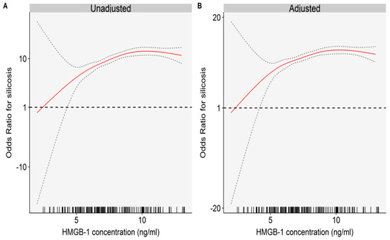 Nonlinear associations between HMGB-1concentrations and silicosis: (A) single factor logistic regression; and (B) model was adjusted for age (continuous), BMI (continuous), smoking status (no, yes), drinking status (no, yes), and passive smoker (no, yes).