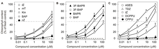 Evaluation of the biological activity of (A) classical cytokinins, (B) 3-fluoro derivatives of BAP and BAPR and (C) urea based cytokinins in the wheat leaf senescence assay performed in the dark (according to [19]). The dotted line indicates where the chlorophyll content in the leaves is 50% of that in fresh control leaves, while 100% represents the chlorophyll content in fresh control leaves. Dashed lines indicate values for the control treatment (DMSO control) with no added compound. Error bars show the S.D. of the mean for four replicate determinations.