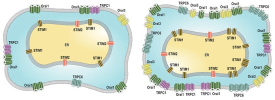 - Ong, H.L.; Cheng, K.T.; Liu, X.; Bandyopadhyay, B.C.; Paria, B.C.; Soboloff, J.; Pani, B.; Gwack, Y.; Srikanth, S.; Singh, B.B.; et al. Dynamic assembly of TRPC1-STIM1-Orai1 ternary complex is involved in store-operated calcium influx. Evidence for similarities in store-operated and calcium release-activated calcium channel components. J. Biol. Chem. 2007, 282, 9105–9116. [Google Scholar] [CrossRef] [PubMed]