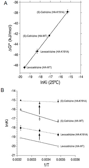 Thermodynamic binding properties of levocetirizine and (S)-cetirizine. (A) Scatter plots of values of ∆Gº versus lnKi at 25 °C: increases in ∆Gº and lnKi represent reductions in the affinities of ligands for H1 receptors; (B) van ‘t Hoff plots for levocetirizine and (S)-cetirizine: According to the van ‘t Hoff equation, lnKi = ∆Hº/RT − ∆Sº/R, the slope and intercept of the vertical axis represent ∆Hº/R and −∆Sº/R, respectively; (C) Scatter plots of values of −T∆Sº versus ∆Hº: compounds with a negative value of ∆Hº and positive value of −T∆Sº are classified as enthalpy-driven; conversely, compounds with a positive value of ∆Hº and negative value of −T∆Sº are classified as entropy-driven. Compounds with negative values of ∆Hº and −T∆Sº are classified as enthalpy- and entropy-driven. Reductions in the values of ∆Hº and −T∆Sº represent increases in the binding forces of the ligands mediated via enthalpy and entropy, respectively. Arrows indicate changes induced by the mutation of Lys191 to alanine.