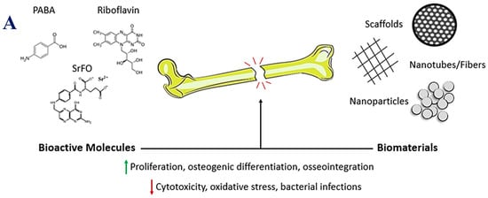 | Riboflavin and derivatives | Free riboflavin and its derivatives | Murine | MC3T3-E1 | Promoted osteoblastic differentiation, enhancing the effects of the typical inductors | [21] | |