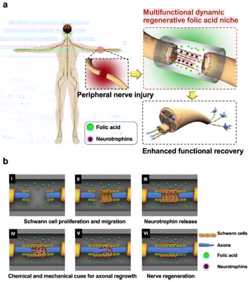 | Nervous System Repair | Folic acid | FA-loaded-CUPE nerve guidance conduits | Murine | Rat Schwann and PC-12 Adh cells | FA induced NT-3, NT-4/5 release and promoted proliferation and migration of both cell lines and differentiation of PC-12 | [33] |