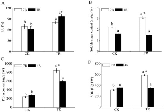 Figure 1. Responses of physiological parameters under freezing stress. (A) Variations in electrolyte leakage. (B) Soluble sugar content. (C) Proline content. (D) Superoxide dismutase (SOD) activity. Control (CK) refers to the control treatment at 20 °C; TR represents the freezing treatment at −4 °C; 7R and 4R represent the winter turnip rape varieties, Longyou 7 and Tianyou 4, respectively; the mean and SD were calculated from three repeats of each treatment; the bars indicate the standard deviation; the columns marked with different letters (a and b) indicate significant statistical differences among the CK and TR of two varieties based on Ducan’s multiple range tests (*p < 0.05). The column marked with an asterisk indicates the significant difference in treatment (TR) of two varieties based on an independent-samples t-test (*p < 0.05).