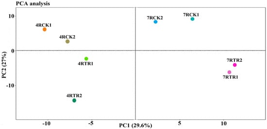 Figure 2. Principle component analysis (PCA) of the proteome from the freezing-stressed and non-stressed winter turnip rape roots. 7RCK and 7RTR denote CK and TR treatments of the R7 variety, respectively. 4RCK and 4RTR denote CK and TR treatments of the R4 variety, respectively.
