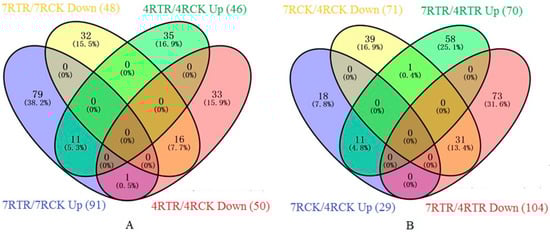 Figure 3. Venn diagrams of the differentially abundant proteins (DAPs) of different comparison groups. (A) Venn diagrams of the DAPs between 7RTR and 7RCK as well as those in 4RTR and 4RCK. (B) Venn diagrams of the DAPs between 7RTR and 4RTR as well as those in 7RCK and 4RCK. 7RTR/7RCK is the protein abundance ratio of 7RTR to 7RCK, 4RTR/4RCK is the protein abundance ratio of 4RTR to 4RCK, 7RCK/4RCK is the protein abundance ratio of 7RCK to 4RCK, and 7RTR/4RTR is the protein abundance ratio of 7RTR to 4RTR.
