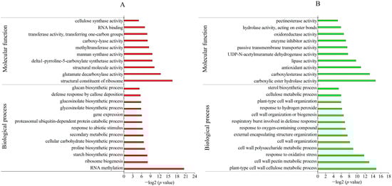Figure 4. Gene ontology (GO) enrichment analysis of up- and down-accumulated DAPs between 7RTR and 7RCK. (A) Up-accumulated proteins. (B) Down-accumulated proteins.