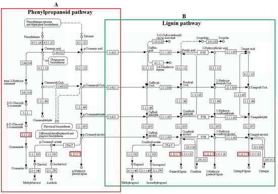 Figure 7. DAPs involved in phenylpropanoid and the lignin pathway of winter turnip rape. (A) Phenylpropanoid pathway. (B) Lignin pathway. The colored enzyme codes are noted as follows: Gly-Asp-Ser-Leu (GDSL) esterase/lipase (EC: 3.2.1.21), Peroxidase C3 and Peroxidase A2 (EC: 1.11.1.7).