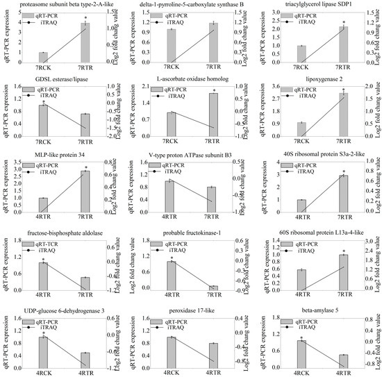 Figure 8. Analysis of the transcript levels of DAPs by a quantitative real-time polymerase chain reaction (qRT-PCR). The candidate genes were from differential protein genes between 7RTR and 7RCK, between 7RTR and 4RTR, and between 4RTR and 4RCK. Statistically significant differences (Duncan’s multiple range tests, * p < 0.05) of transcription analysis by qRT-PCR are indicated by asterisks.