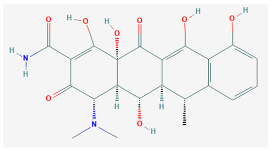 Structure of Doxycycline (DOX) C22H24N2O8. Image taken from The National Center for Biotechnology Information. PubChem Compound Database; CID = 54671203, https://pubchem.ncbi.nim.nih.gov/coumpund/54671203 (accessed on 12 December 2018).