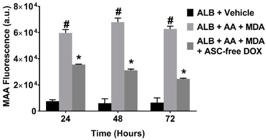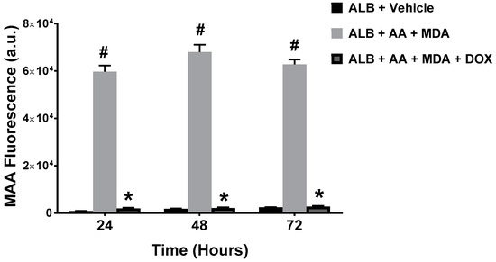 To determine whether DOX inhibits the generation of MAA-adducts, we produced MAA-adducts in a cell-free system, by incubating MDA and AA (in a 2:1 molar ratio) with ALB to form MAA-ALB. The formation of MAA-ALB was monitored by its autofluorescence [14]. As shown in Figure 2, the fluorescence of the MDA, AA and ALB reaction increased compared with the ALB and vehicle control reaction. Inclusion of pharmaceutical DOX to the MDA, AA, and ALB reaction significantly attenuated the increase in fluorescence at all time points investigated, indicating decreased formation of MAA-ALB.
