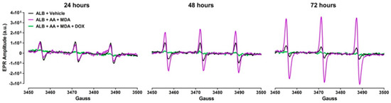 ROS are produced by the interaction of MDA and AA with amino groups of proteins, primarily the ε−amino group of lysines [20,21]. Because DOX attenuated the formation of MAA-ALB (Figure 2), we also investigated whether DOX decreased the levels of ROS produced during the formation of MAA-protein adducts. To accomplish this, ALB was incubated with MDA and AA in the presence or absence of 1 mg/mL pharmaceutical DOX, and ROS were measured by EPR spectroscopy. The results presented in Figure 3 demonstrate that incubation of MDA with AA and ALB produced ROS as demonstrated by the increase in the EPR spectrum amplitude (which is directly proportional to the levels of ROS in the sample) over the 72 h time period. In contrast, inclusion of DOX markedly reduced the increase in the EPR spectrum amplitude, indicating that DOX directly scavenges the ROS produced during MAA-adduct formation.