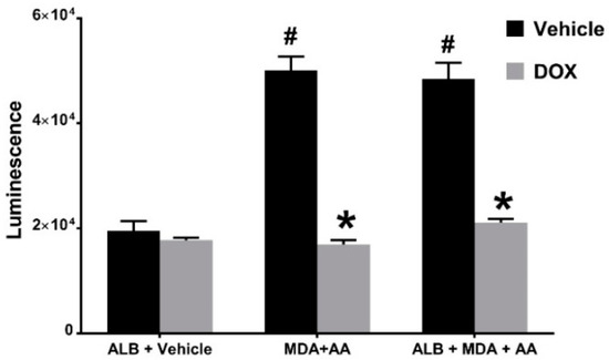 To expand upon the cell-free studies described above and gain insight into whether DOX acts as an antioxidant in biological systems, we utilized HEK 293 Nrf2/ARE cells to investigate the capacity of pharmaceutical DOX to inhibit ROS-mediated activation of Nrf2, a redox-sensitive transcription factor. Culturing HEK 293 Nrf2/ARE cells in media containing MDA and AA, in the presence or absence of ALB for 24 h significantly increased Nrf2 activation, as demonstrated by increased luminescence (Figure 4). Nrf2 activation was significantly attenuated by the inclusion of 1 mg/mL pharmaceutical DOX indicating that the elevated levels of intracellular ROS induced by MDA and AA-mediated formation of MAA-adducts are scavenged by DOX. These results demonstrate that the ROS intermediate of the MAA-adduct or ROS produced during MAA-adduction are able to activate/stabilize Nrf2 and that DOX is able to scavenge these oxidants.
