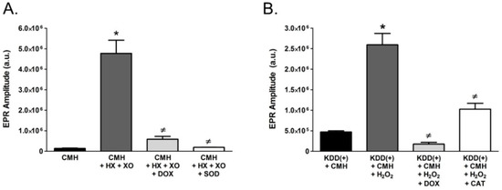 To determine whether DOX directly scavenges specific ROS, particularly superoxide (O2•−), cell-free reactions containing hypoxanthine (HX) and xanthine oxidase (XO), which produce O2•−, were utilized [19]. Samples were prepared with 200 µM CMH spin probe, 50 µM HX, and 10 mU/mL XO with or without 1 mg/mL DOX in 100 µL of EPR buffer (99 mM NaCl, 4.69 mM KCl, 2.5 mM CaCl2, 1.2 mM MgSO4, 25 mM NaHCO3, 1.03 mM KH2PO4, 5.6 mM d-glucose, 20 mM HEPES) pH 7.4, supplemented with 5 µM and 25 µM of the metal chelators diethyldithiocarbamate (DETC) and deferoxamine, respectively (19). To ensure the fidelity of the assay and confirm the measurement of O2•− specifically, control reactions containing CMH, HX, XO, and 400 U copper/zine superoxide dismutase (SOD) were performed. SOD is an antioxidant enzyme that specifically catalyzes the dismutation of O2•− into hydrogen peroxide (H2O2) and oxygen. Samples were incubated at 37 °C for 30 min and the EPR spectra were determined.