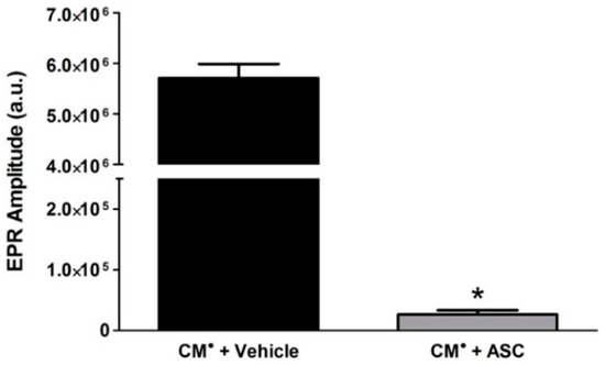 Ascorbic Acid (ASC) Reduces Stable CM• to Non-EPR Detectable CMH Increase. EPR spectroscopy was performed using 200 μM of the stable CM• EPR probe in the presence or absence of 4.8 mg/mL of ASC. (* p < 0.0001) vs. CM• and vehicle. N = 3.