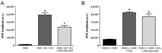 Because ASC reduced the stable EPR spin probe radical to the non-EPR detectable form, we repeated the aforementioned EPR spectroscopy experiments using ASC-free DOX. ASC-free DOX (1 mg/mL) significantly attenuated the EPR spectrum amplitude obtained from cell-free reactions containing CMH, HX, and XO (Figure 7A), indicating that DOX itself is capable of directly scavenging O2•−. In contrast, ASC-free DOX failed to impact the EPR spectrum amplitude obtained from reactions containing the KDD(+) buffer, CMH, and H2O2 (Figure 7B), which demonstrates that ASC-free DOX does not directly scavenge H2O2.