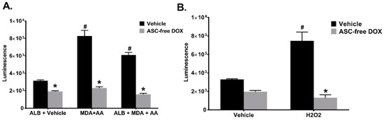 The HEK 293 Nrf2/ARE cells were grown to confluency and incubated with either 1 mg/mL ALB, 2 mM MDA and 1 mM AA, or 1 mg/mL ALB, 2 mM MDA and 1 mM MAA in the presence or absence of 1 mg/mL pharmaceutical DOX or 1 mg/mL ASC-free-DOX for 24 h. After incubation, the growth media was removed and the cells were lysed using a passive lysis buffer as recommended by the manufacturer (Promega, Madison, WI, USA). The luciferase substrate (Signosis) was added to the lysates and luminescence was measured using a Turner Biosystems (Sunnyvale, CA, USA) LS-5B luminometer.