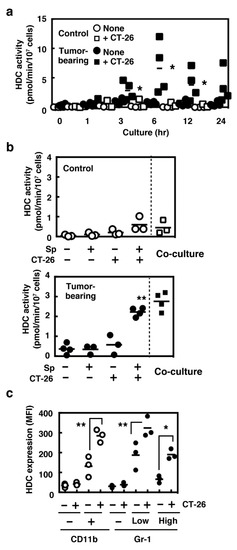 (a) Splenocytes were collected from the control (open symbols) and tumor-bearing mice (closed symbols) and then cultured in the absence (circles) or presence of CT-26 cells (squares) for the periods indicated. l-Histidine decarboxylase (HDC) activity was measured in the cultured splenocytes. (b) Cultures of splenocytes were performed under various conditions, as described above, for 6 h, and the conditioned media were then collected. Splenocytes from the control (open symbols) and tumor-bearing mice (closed symbols) were incubated in each conditioned medium for 6 h, and HDC activity was measured. HDC activity in the splenocytes co-cultured with CT-26 cells was measured as the reference. (c) Expression levels of HDC in the splenocytes derived from the tumor-bearing mice co-cultured with or without CT-26 cells were measured using flow cytometry with the antibodies raised against CD11b, Gr-1, and HDC. The expression of HDC was analyzed in the subpopulations of the splenocytes. Multiple comparisons were performed using one-way ANOVA with the Tukey post test. Values with * p < 0.05 and ** p < 0.01 are regarded as significant.