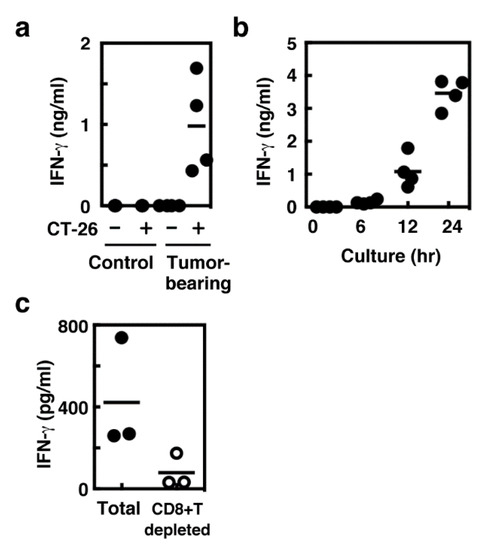 (a) Splenocytes were collected from the control and tumor-bearing mice and then cultured in the absence or presence of CT-26 cells for 24 h. The amounts of IFN-γ in the medium were measured. (b) Splenocytes were collected from the tumor-bearing mice and co-cultured with CT-26 cells for the periods indicated. The amounts of IFN-γ in the medium were measured. (c) Total splenocytes derived from tumor-bearing mice or those with depleted CD8+ T cells were co-cultured with CT-26 cells for 24 h. The amounts of IFN-γ in the medium were measured.