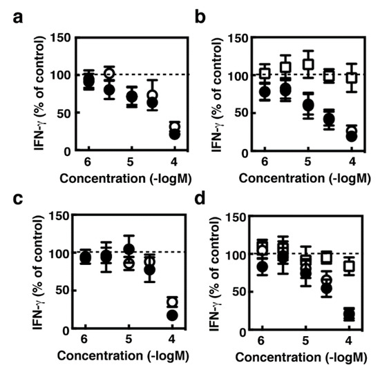 Suppressive effects of these histamine receptor antagonists on IFN-γ production were observed in relatively higher concentrations, indicating that a majority of the reported findings using these compounds should not be associated with suppressed IFN-γ production. This study will contribute to the development of novel therapeutic compounds targeting IFN-γ, which plays a critical role in the pathology of various diseases, such as autoimmune diseases and inflammatory bowel diseases [30,31].