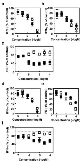 Splenocytes derived from the wild type mice (a–c) and HDC−/− mice (d–f) were stimulated with concanavalin A (5 µg/mL) for 24 h in the presence of the indicated concentrations of pyrilamine (a,d, open circles), diphenhydramine (a,d, closed circles), cimetidine (c,f, open squares), JNJ7777120 (b,e, open circles), thioperamide (b,e, closed circles), and histamine (c,f, closed squares). The amounts of IFN-γ in the medium are presented as the percentages of the control. Values are presented as the mean ± SEM (n = 3).
