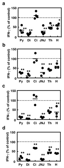 Splenocytes derived from the BALB/c mice (a), HDC−/− mice (b), C57Bl6 mice (c), and Hh1r−/− mice (d) were stimulated in the culture plates coated with an anti-CD3 antibody and an anti-CD28 antibody for 24 h in the presence of 100 µM of pyrilamine (Py), diphenhydramine (Di), cimetidine (Ci), JNJ7777120 (JNJ), thioperamide (Th), and histamine (H). The amounts of IFN-γ in the medium are presented as the percentages of the control. Multiple comparisons were performed using one-way ANOVA with the Tukey post test. Values with * p < 0.05 and ** p < 0.01 are regarded as significant.