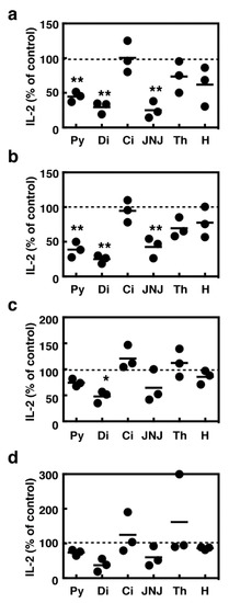 Splenocytes derived from the wild type mice (a,c) and HDC−/− mice (b,d) were stimulated with concanavalin A (5 µg/mL, a,b) or in the culture plates coated with an anti-CD3 antibody and an anti-CD28 antibody (c,d) for 24 h in the presence of 100 µM of pyrilamine (Py), diphenhydramine (Di), cimetidine (Ci), JNJ7777120 (JNJ), thioperamide (Th), and histamine (H). The amounts of IL-2 in the medium are presented as the percentages of the control. Multiple comparisons were performed using one-way ANOVA with the Tukey post test. Values with * p < 0.05 and ** p < 0.01 are regarded as significant.