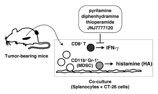 Accumulating evidence suggests that MDSC may be the major source of histamine in tumor tissues, although it remains to be clarified how HDC is induced. We reproduced here the process of induction of histamine synthesis by murine myeloid cells in the tumor tissues by establishing a system in which splenocytes derived from tumor-bearing mice were co-cultured with mitomycin c-treated tumor cells (Figure 7). HDC-expressing cells were found to be CD11b+Gr-1+ cells, raising the possibility that histamine synthesis was induced in MDSC in our model. The induction of histamine synthesis was limited to the situation in which tumor immunity was established. It is likely that CT-26 cells triggered acquired immunity against themselves during the co-culture period, and thus stimulated the production of a wide variety of cytokines, including IFN-γ. As the conditioned medium may induce histamine synthesis in the splenocytes derived from tumor-bearing mice, it is likely that soluble mediators, such as cytokines, induced upon tumor immunity may act on the surface receptors on the splenocytes to induce HDC. Previous studies demonstrated that several cytokines are involved in induction of histamine synthesis. Interleukin-3 can induce histamine synthesis in murine bone marrow [3]. Injection of IL-1 into mice was found to induce histamine synthesis in various tissues, such as bone marrow, spleen, lung, and liver, as well as lipopolysaccharide (LPS) injection [17]. Several studies suggested that GM-CSF can also induce HDC in bone marrow-derived cells [6,18]. Although we could not identify the cytokines that might be responsible for induced histamine synthesis, our co-culture model will be useful for identifying the putative HDC-inducing factors.