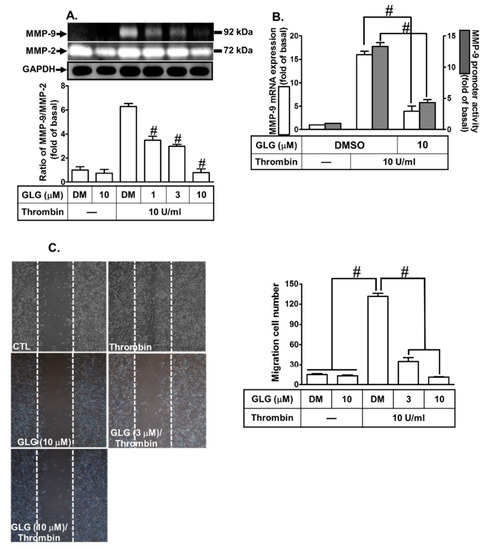 Galangin (GLG) reduces thrombin-induced pro-form (pro) MMP-9 expression and cell migration in SK-N-SH cells. (A) The cells were pretreated with galangin (1, 3, 10 μM) for 1 h and then incubated with 10 U/mL thrombin for 16 h. The conditioned cell culture media were collected to measure the MMP-9 expression by gelatin zymography. The activity of proMMP-9 was normalized to that of MMP-2. The cell lysates were analyzed by western blot to determine the expression of glyceraldehyde-3-phosphate dehydrogenase (GAPDH), serving as the marker for the cell viability during these treatments. (B) The cells were pretreated with galangin (10 μM) for 1 h and then incubated with 10 U/mL thrombin for 16 h (mRNA expression) or 24 h (promoter activity). The mRNA expression and promoter activity of MMP-9 were determined by real-time PCR and promoter assay, respectively. (C) The cells were plated on 6-well culture plates, grown to confluence, and then starved with serum-free medium for 24 h. At that point, the cells were pretreated with galangin (3 or 10 μM) for 1 h and then incubated with thrombin for 48 h. Images of the migratory cells were taken at the indicated conditions. The data are expressed as mean ± SEM of three independent experiments. # p < 0.01, as compared with the cells exposed to thrombin alone. −: no treatment with Thrombin; DM: DMSO (dimethyl sulfoxide).