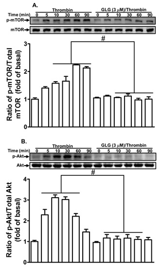 2.4. Galangin Reduces Thrombin-Stimulated Phosphorylation of Mammalian Target of Rapamycin (mTOR)