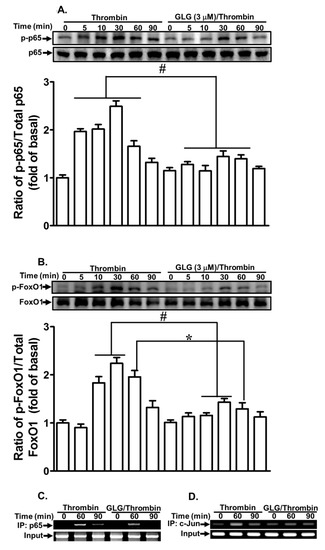 Several transcription factors, such as NF-κB, AP-1, and FoxO1, have been revealed to be involved in MMP-9 expression in various cell types [20,41,42,43]. Our previous studies also showed that NF-κB and AP-1 contribute to the thrombin-induced MMP-9 expression in SK-N-SH cells [20,21]. Here, we explored whether galangin blocked the transcription factors involved in the thrombin-induced MMP-9 expression in SK-N-SH cells. The NF-κB, AP-1, and FoxO1-dependent pathways were detected by western blot and chromatin immunoprecipitation (ChIP) assays. Our results showed that pretreatment with galangin significantly reduced the thrombin-stimulated phosphorylation of p65 (Figure 6A) and FoxO1 (Figure 6B). The interactions of p65 (Figure 6C) and c-Jun (Figure 6D) with MMP-9 promoter were blocked by galangin in SK-N-SH cells challenged by thrombin. These results indicated that galangin reduces the thrombin-induced MMP-9 expression by suppressing the activation of the transcription factors, including NF-κB, AP-1, and FoxO1 in SK-N-SH cells.