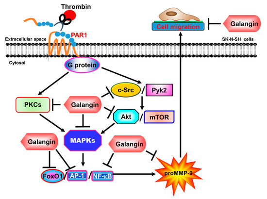 The schematic signaling pathways involved in galangin inhibiting the MMP-9 expression in SK-N-SH cells challenged with thrombin. Galangin inhibits MMP-9 expression by attenuating c-Src, Pyk2, PKCα/β/δ, Akt, mTOR, p42/p44 MAPK, p38 MAPK, and JNK1/2 phosphorylation to decrease NF-κB, AP-1, and FoxO1 activation and ultimately reduces SK-N-SH cell migration.