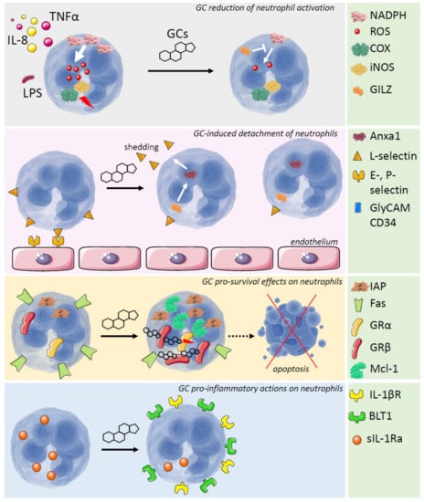 Cells that are capable of engulfing external pathogens are common among evolutionarily related species. In humans, these cells are called neutrophils, and they represent 50% to 70% of the total leukocytes in blood. The complex role of neutrophils has been discovered over the years, and they have been found to have the dual ability to resolve inflammation and infections, and destroy host tissues. Neutrophils, which are short-lived, adaptable and highly mobile cells of the innate immune system, are released from the bone marrow into the bloodstream after completion of the differentiation process. In the absence of inflammatory signals, they die via apoptosis within 8–12 h. In case of infection or inflammation, their life span is extended up to 1 or 2 days to permit extravasation and migration into inflamed tissues [1,2,3]. As observed in the case of other leukocytes, several neutrophil functions are controlled by glucocorticoids (GCs). These hormones have a wide range of effects in all types of cells and regulate many physiological responses, from glucose metabolism to immune reactions. The modulation of both innate and adaptive immune responses by GCs is necessary for the protection of an organism from harmful external agents and for potentiating innate immune reactions against invading pathogens [4,5,6,7].