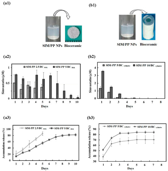 Two types of porous bioceramic samples are shown below: one is disk mold (a1, ϕ 5 mm; h 0.7 mm) and the other is hollow cylinder mold (b1, ϕ1 3.5 mm; ϕ2 1.5 mm; h 10 mm), these are all combined with SIM-PP nanoparticles and promote bone growth. Daily release profiles of the active form of simvastatin (act-SIM) measured by high-pressure liquid chromatography at 37 °C for 7–10 days. (a2) SIM-PP NPs loaded within disk bioceramic samples (ϕ 5 mm; h 0.7 mm; BCdisk). (b2) SIM-PP NPs loaded within hollow cylinder bioceramic samples (ϕ1 3.5 mm; ϕ2 1.5 mm; h 10 mm). (a3,b3) Average percentages of act-SIM cumulative release. Notes: SIM-PP NP 2.5/BCdisk: the 2.5 μg simvastatin loaded with disk bioceramic; SIM-PP NP 5/BCdisk: the 5.0 μg simvastatin loaded with disk bioceramic; SIM-PP NP 5/BCcylinder: the 5.0 μg simvastatin loaded with hollow cylinder bioceramic; SIM-PP NP 10/BCcylinder: the 10.0 μg simvastatin loaded with hollow cylinder bioceramic.