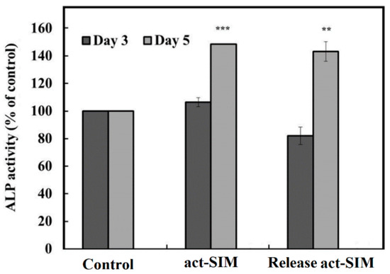 Alkaline phosphatase (ALP) activity evaluated in D1 cells. D1 cells were treated with 0.5 µM active form of simvastatin (act-SIM) in bone medium or treated with 0.5 μM act-SIM released from SIM-PP NPs loaded within bioceramic samples in bone medium for 5 days. The cells were further cultured in osteoinduction medium (OIM) for another 3 and 5 days. The control groups were not treated with act-SIM. Note: *** p < 0.001 and ** p < 0.01 com pare to day 5 Control.